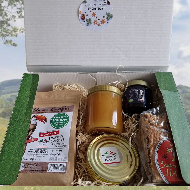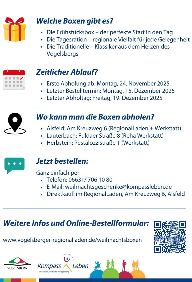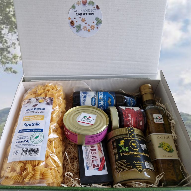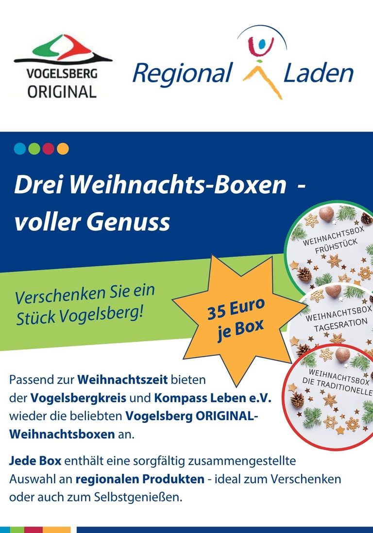 Passend zur Weihnachtszeit bietet der Vogelsbergkreis gemeinsam mit dem Sozialdienstleister Kompass Leben e.V. wieder die beliebten Vogelsberg ORIGINAL-Weihnachtsboxen an. Kundinnen und Kunden können zwischen drei verschiedenen Genussrichtungen wählen.